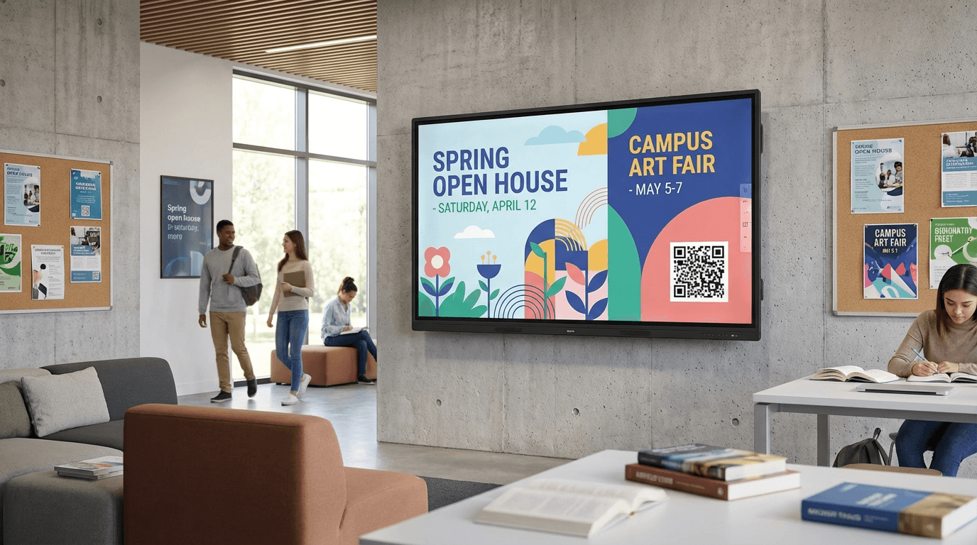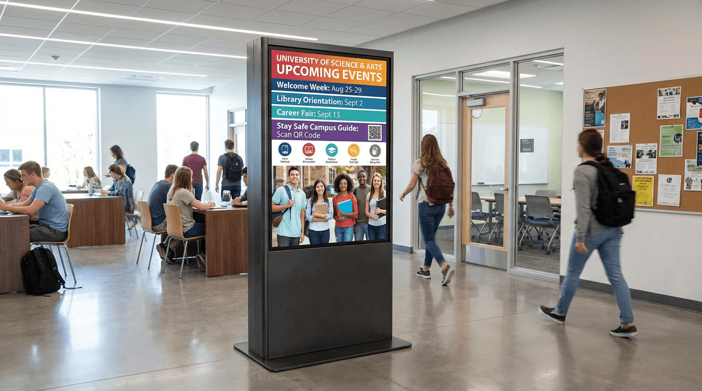 Schools, colleges, and universities use displays for campus notices, event announcements, digital directories, schedules, emergency messaging, and classroom communications.