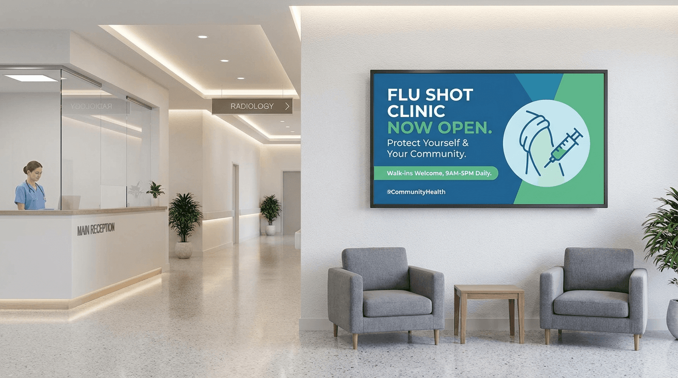 Hospitals and clinics use digital signage for patient communication, queue management, wayfinding, digital notice boards, and public health education with hygienic, reliable 24/7 commercial displays.