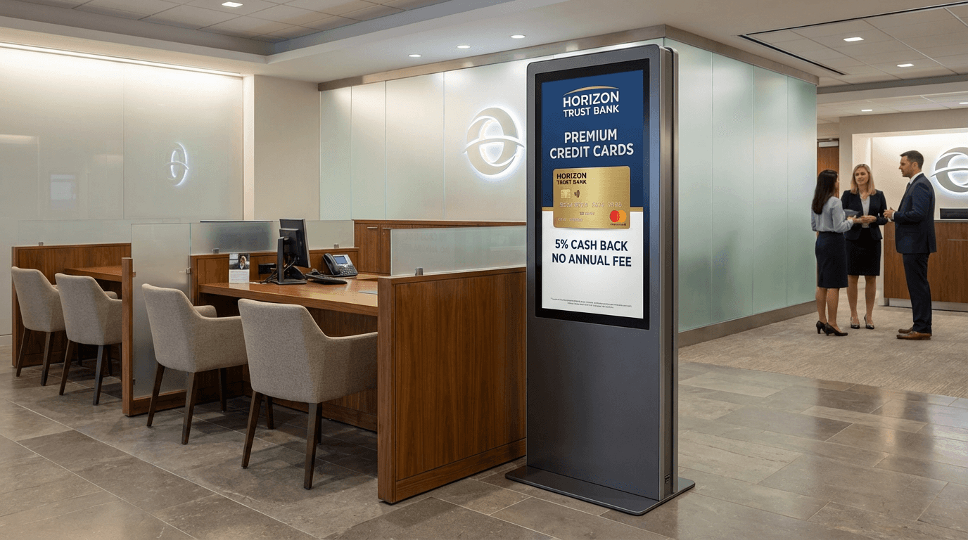 Financial institutions rely on signage for queue management, digital product marketing, service announcements, investor communications, and video wall branding.