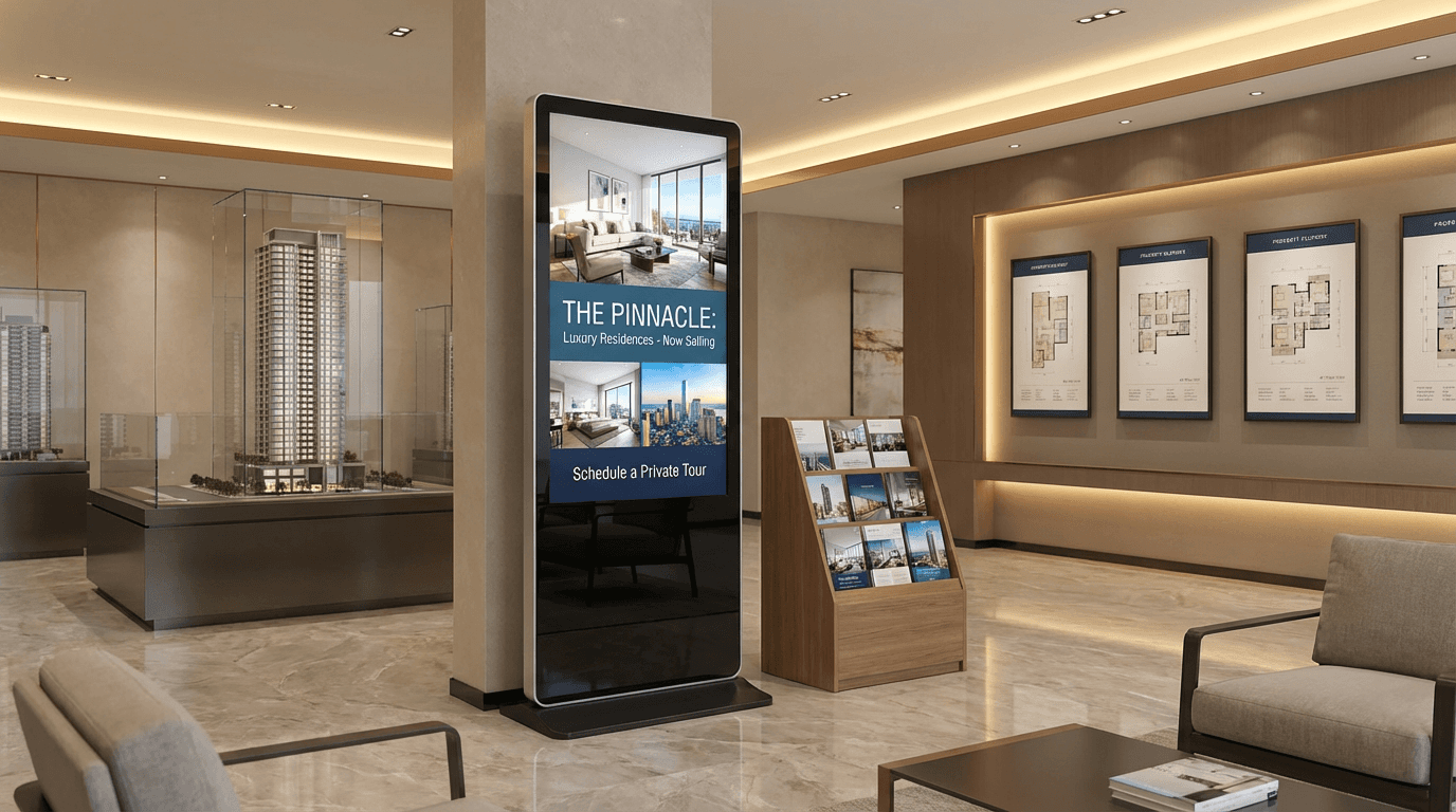 Property developers and brokerages use interactive kiosks, 4K video walls, and transparent displays to present listings, walkthroughs, and promotional content.