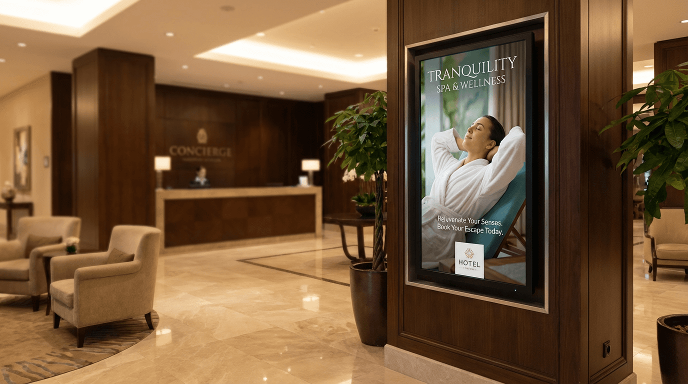 Hotels, resorts, and entertainment venues rely on digital signage for welcome messaging, wayfinding, promotions, digital concierge, event boards, and guest information fully centralized via RDM Studio.